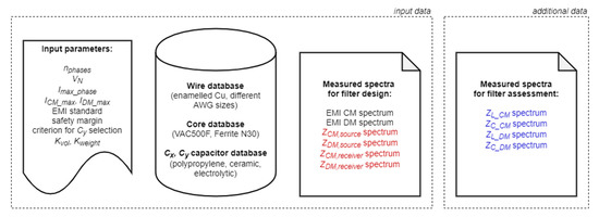 Besides the databases of commercial components and the characteristics of the filter application, such as the power electronic circuits and the constraints of the filter design, the proposed procedure processes the measured spectra of the CM/DM impedance of the EMI source and receiver. Furthermore, it performs a final assessment of filter performance to evaluate the effect of the non-ideal electrical components used even before building and testing the filter; to this aim, it requires the measured frequency response of the CM and DM components selected for the designed filter. All the required measurements can be performed easily using an LCR meter capable of working in the EMI frequency range.