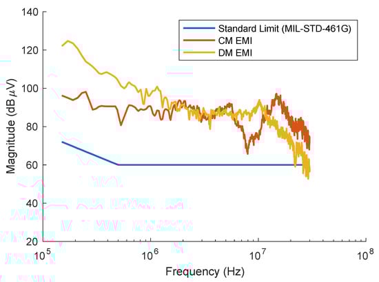 Standard limit superimposed to the measured CM and DM EMI spectra.