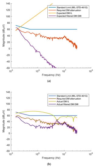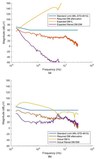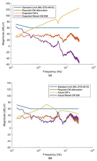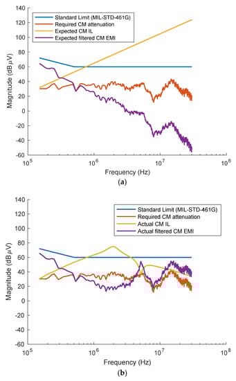 Although not required by the proposed procedure, the expected filter performance obtained without performing the final assessment task (i.e., without considering the actual behavior of the used inductors and capacitors) has also been evaluated for the sake of comparison. Such performance is reported in Figure 13a and Figure 14a for the CM and DM EMI, respectively. On the other hand, the actual filter performance (i.e., considering the non-ideal behavior of the used inductors and capacitors) is reported in Figure 13b and Figure 14b, together with the limit imposed by the standard, and shows satisfying performance.