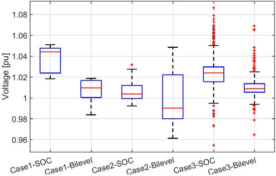 Now consider Figure 1 which depicts the distribution of bus voltages calculated by both models for each case. The horizontal red lines inside the boxes indicate the median of the voltages in the network. One can observe that under each case the bus voltages of the majority of buses are lower when calculated by the bi-level-OFD model as compared with the SOC-OFD model.
