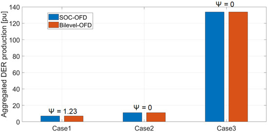 Aggregated production of DER buses, and curtailment level (), calculated by SOC-OFD model (the blue bars) and bi-level-OFD model (the red bars) for the three cases.