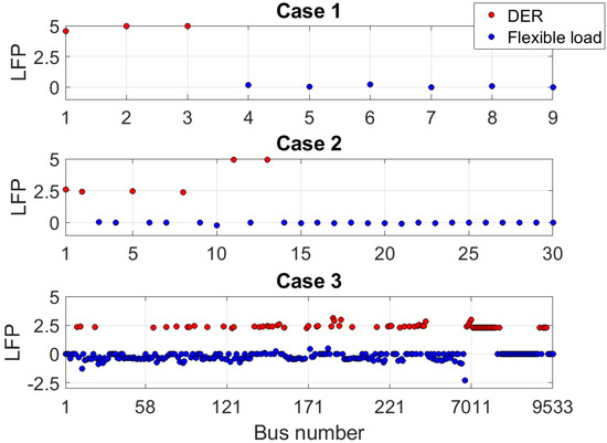Figure 3 and Figure 4 respectively present the LFPs and the flexibility dispatch from each bus, as calculated by the bi-level-OFD model for Case 1 (the top sub-plot), Case 2 (the middle sub-plot), and Case 3 (the bottom sub-plot). Variable indicates the aggregated active power flexibility dispatched from bus i.