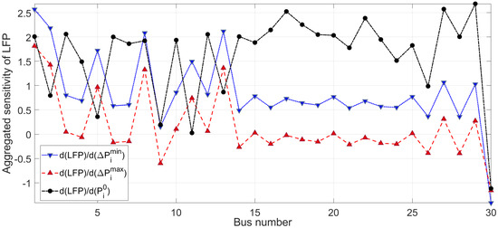 The black line in Figure 5 and Figure 6 represents the sensitivity of the LFPs to perturbation in the base-power program of different buses (i.e., ). Comparing the DER buses with the flexible load buses, one can observe that in general, a perturbation in of the load buses has a larger impact on the LFPs throughout the entire network.
