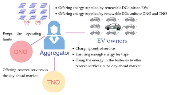 Several methods have been developed to deal with the integration of EVs and renewable energy systems in distribution systems [26,27,28,29]. The optimal operation of unbalanced EDS with PV units, EVs, and energy storage devices is achieved through a dynamic scheduling method proposed in [30], in which the local renewable energy consumption provided by the photovoltaic units is encouraged. Nevertheless, the robust technique used to solve the problem does not consider controlling via an aggregator. In [31], an interactive energy management system to incorporate plug-in EV (PEV) in demand response (DR) programs was developed. The novelty of the proposal in [31] is an approach based on multistage decision-making that allows the interaction between PEV owners and aggregators in real-time. This approach makes possible a proper participation of EV owners in DR programs, however, the aggregator does not offer reserve services, it is only an agent responsible for the PEV charging coordination. A method that introduces the aggregator, designed as an intermediary agent between end users and the DNO was proposed in [32], considering EVs as responsive loads, whereby the aggregator is a managing agent that receives information related to EVs and can offer reserve energy. On the other hand, the aggregator makes a forecast of renewable generation to inform the DNO about the amount of energy available. However, it does not make any profit due to the selling of renewable energy.