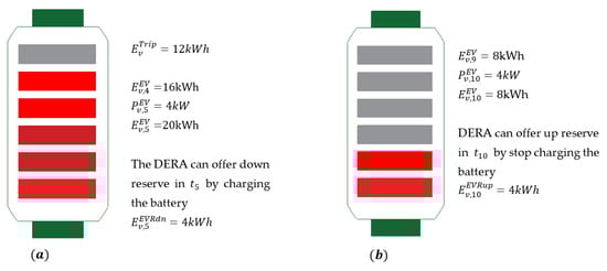 Illustrative example of using the energy of the EV batteries to offer up and down reserve (a) Time interval , (b) Time interval .
