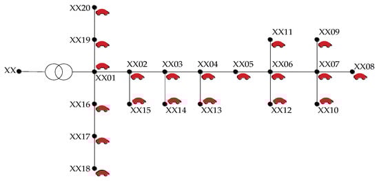 The proposed model is tested in a 34-bus distribution system with a medium-voltage (MV) level of 24.9 kV and a low-voltage level (LV) of 220 V [39]. The system frequency is 60 Hz. The limits for the maximum and minimum voltage magnitude were defined as 1.00 and 0.90 p.u., respectively. The voltage magnitude at the substation was fixed at 1 p.u. The parameter was set at 10, while was 500 A for all feeders. The parameters and were 5° and 3°, respectively. A three-phase EDS with secondary networks connected through medium-voltage level nodes is considered for the system representation, as shown in Figure 3. Figure 4 illustrates the topology of each secondary network, which is connected at a medium-voltage node through a MV/LV transformer represented by “xx”. The test system has 33 secondary networks connected at the MV nodes of the 34-bus distribution system.