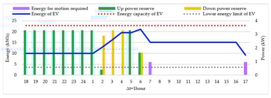 An example of using the energy of an EV battery to offer reserve services is illustrated in Figure 2. The maximum charging power is and the energy capacity is . Two periods are represented: and . The EV owner previously informed to the aggregator that he/she would make a trip, requiring , between and , i.e., the EV will be available for charging in . It is assumed that the EV energy before is and it is charged at . Before starting the trip, the aggregator can use the additional capacity in the battery and charges the EV, offering down reserve . On the other hand, in , the aggregator can schedule the charging () so the EV can be charged after the trip. Thus, it can also offer up reserve , stopping the charging if required by the TNO.
