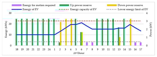 The energy stored in every EV at each time interval is dependent on the previous state as indicated by Equation (21). Constraint (22) is added to limit the amount of charging power according to the battery capacity. The energy stored in the EV battery should be larger than the energy required for transportation, as established by Equation (23). Furthermore, the energy stored in each EV battery cannot exceed the minimum and maximum energy capacity, as indicated in Equation (24). If additional capacity is available in the battery, it can be used to provide down and up reserve services as shown in Equations (25) and (26). Constraint (27) limits the energy that can be offered for up reserve according to rated power of the charger and the EV availability. Finally, the DERA can only offer up reserve if the charging corresponding to the energy requirements of the EV () has been previously scheduled, as indicated by (28).