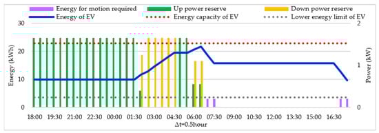 In the case of the down reserve, the battery is charged to provide this service, taking into account the maximum battery energy level. EV owners get the energy required for transportation, while the aggregator may use the remaining energy in the battery to offer down reserve services.