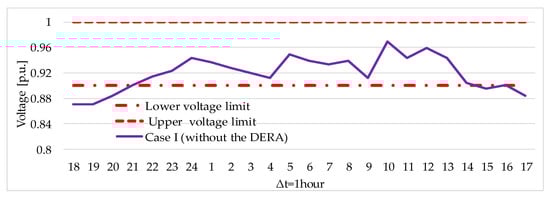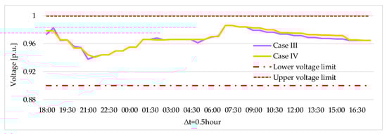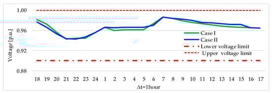 The energy capacity of EV batteries is 22.8 kWh with a maximum charging power rate of 3.3 kW [40]. It is estimated that the is updated in each initial period of charging control through communication devices. The aggregator has a contract with 660 EV owners. The values of the initial SOC of the battery vary within a range of 13–30%. EVs are connected to the secondary network, at nodes xx01–xx20 as shown in Figure 4.