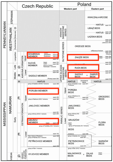 Lithostratigraphic division of the Polish and Czech parts of the Upper Silesian Coal Basin, according to [27], modified by [28] and [29] (Polish part), and [30] modified by [31] and [32] (Czech part). Modified. In red frames, lithostratigraphic formations from which the samples were taken for research are shown.