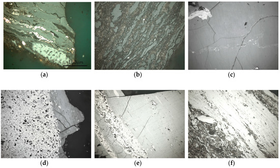 (a) Low-rank coal—a part of coal made of vitrinite, inertinite, and liptinite macerals, as well as smudges of mineral matter; (b) low-rank coal—carbominerite part—mineral matter (loam) overgrowing coal parts made of vitrinite maceral group; (c) medium-rank coal—cracked vitrinite—colotelinite and a part of a inertinite macerals; (d) medium-rank coal—a large inertinite (fusinite) part and a smaller part made of vitrinite; (e) high-rank coal—a lightly cracked part made of vitrinite with an inertinite lamella; and (f) high-rank coal—vitrinite and minerals; reflected light, immersion.
