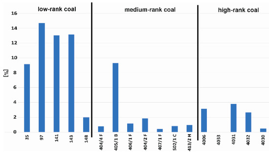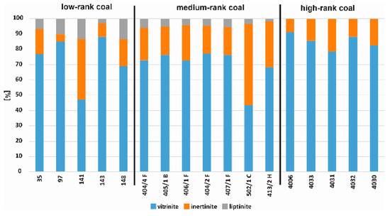 Measured reflectance encompassed the characteristic values of medium-rank hard coal—types A, B, and C according the UN-ECE classification [51]. Thus, for the purpose of the study, the samples were divided into low-, medium-, and high-rank coals. Depending on the metamorphism degree, the coal is characterised by different optical characteristics, clearly visible under a microscopic, mainly as the shades of grey of individual maceral groups (Figure 2a–f). The darkest shade of grey is present in low-rank coals (Figure 2a,b), while highly metamorphized coals are the lightest (Figure 2e,f). Liptinite group macerals in highly metamorphized coals are not visible under the microscope (Figure 2e,f). This effect is caused by the second coalification jump (R0~1.3–1.4%), during which the microscopic properties of liptinite changed [52]. Regardless of the metamorphism degree, almost all of the analysed coal samples showed vitrinite as the dominant maceral; only the 227/22 sample showed the domination of inertinite group macerals (53.28 %) over vitrinite (43.39%) (Table 1, Figure 3). Liptinite group macerals are the most abundant in low-rank coals. Coal samples no. 141 and 148 contained over 13% of these macerals. Medium-rank coal samples contained less than 6% of this component.
