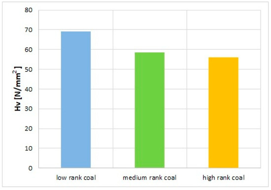 Micro-hardness parameters change with the metamorphism degree and with the structural and textural characteristics of coal. This relationship, described by many authors [52,53,54,55,56], can also be seen in the coals from the USCB area described in this work.