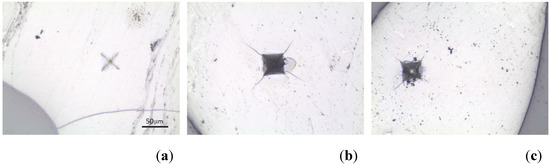 Photographs after the microhardness analysis, showing the nature of cracks and other damage caused by the Vickers indenter being pressed into the analysed material. (a) R0 = 0.8%; (b) R0 = 1.1%; (c) R0 = 2%. Reflected light.