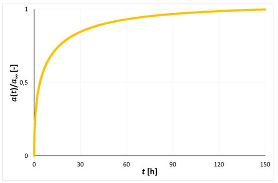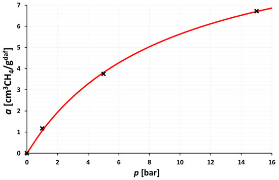 A comparison of measurements with the linear model for sorption capacity under the set pressure a1 is presented in the Equation (11), and its graphical comparison with the obtained results is presented in Figure 10.