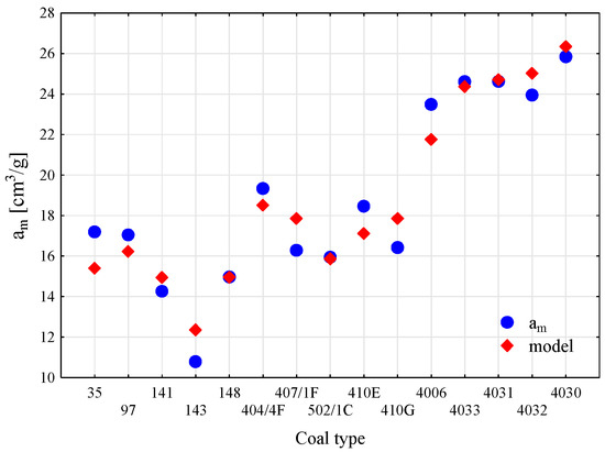 Value comparison between the maximum sorption capacity am and the created regression model (Equation (10)).