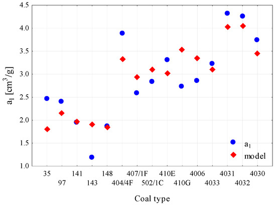 Value comparison between the sorption capacity under set pressure a1 with the created regression model (Equation (11)).