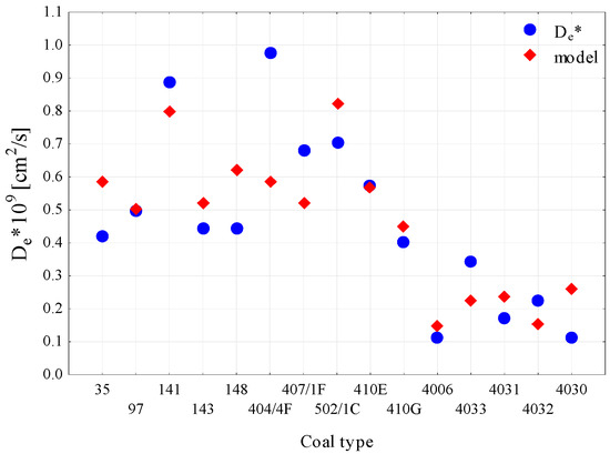 A graphical comparison of the De diffusion coefficient results with the created regression model is presented in Figure 11. This model is statistically correct and explains 62% of data variability. The standard estimation error is 0.16, or about 35% of the average value.