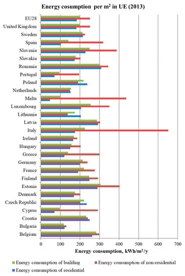 Average energy demand for buildings in the European Union (EU) countries (Source: authors’ own elaboration based on recent EU Buildings Database data [9]).