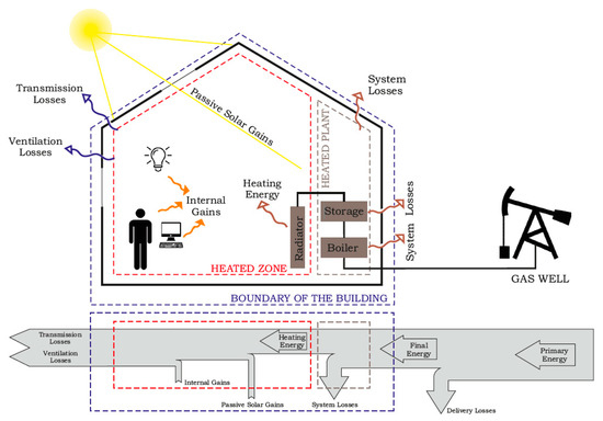 Energy balance of the building with heat gains and losses.