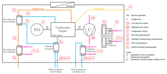 The GAT generator has been fitted with measuring devices in order to control the main parameters responsible for proper system operation. In addition, heat and cooling energy meters have been installed in main system areas, i.e., feed and return of the high and, depending on demand, low parameter of the refrigerant. Data are transmitted via a serial communications protocol - MODBUS RTU and stored in a recording system. Measurements are made using MULTICAL heat meters by Kamstrup. To ensure measurement stability, flow sensors were submitted to a type approval according to EN 1434 [40], which includes the 2400-hour measurement stability test of the flow sensors. Figure 5 shows the diagram of the GAT trigeneration power generator together with location of the measuring devices.