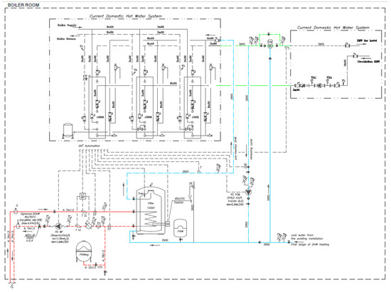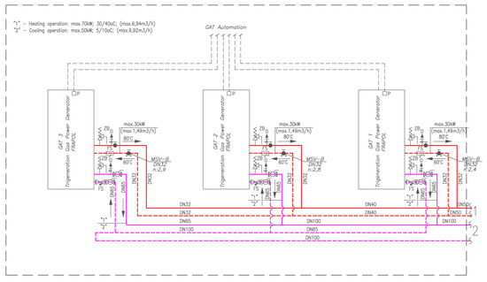 The heat energy from the cooling system for engines of two trigeneration generators and the heat energy recovered from flue gases generated by these devices will be supplied to the district hot water system of the building (Figure 9). On the other hand, the systems for cooling and heat recovery from flue gases generated by the engine of the third generator provide heat for the central heating of the building. Thanks to an additional buffer and an additional circulation system, it is possible to superheat the water stored in the existing tanks.