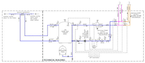 When the heat pump works as a cooling unit, the cooling energy is supplied to the existing chilled water system through the system given in Figure 7. In addition, the functionality is extended by a 2000-liter cooling buffer.