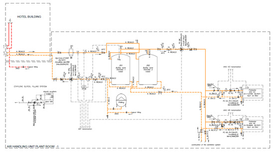 When the heat pump works as a heating unit, the heat energy is supplied to secondary heaters installed in the air handling units. A diagram of the system is given in Figure 8.