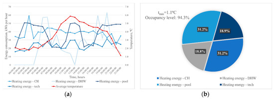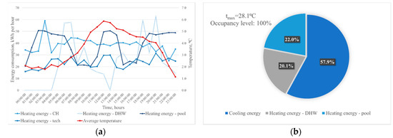 An analogous procedure was used for the cooling season, in the case of which the demand for cooling energy, the demand for energy for preparing district hot water, and the demand for energy for heating the swimming pool were considered. Hourly analysis was performed first. For district hot water, there was a high variability in its consumption. The lowest values were observed at night. In the case of cooling energy, its distribution depended on the outdoor temperature. At night, these values were very low—as much as 10 times lower than in the afternoon when they were the highest. An example of daily heat and cooling energy consumption is given in Figure 14a. As Figure 14b shows, the energy used for cooling purposes formed the majority of the total energy consumption.