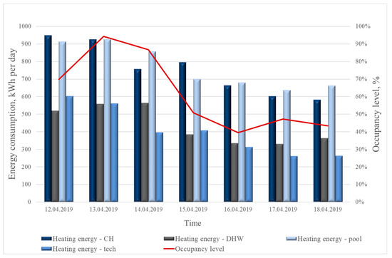 The analysis was then carried out on a weekly basis, comparing heat demand for each of the analyzed systems in Figure 11. Figure 11 also shows the occupancy level. It can be seen that the demand for heat energy for preparing district hot water was strictly dependent on the hotel occupancy. The demand for heat energy needed to heat the building and the demand for heat energy for swimming pool purposes were similar, and clearly dominate over the other values.