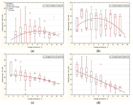 Another step was to examine the relationship between heat energy demand and the outdoor temperature in the analyzed period. The data were ordered and divided into groups in specified temperature ranges. Having removed outliers and extremes, linear relationships were plotted in the form of box plots. Graphs for each analyzed system are shown in Figure 12.