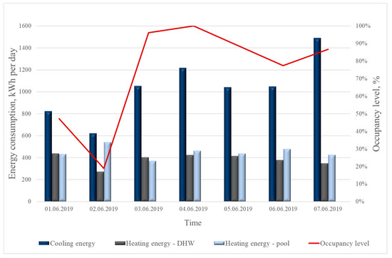 The analysis of the energy performance for the Turówka hotel was carried out based on days and hours, and performed separately for the heating and cooling seasons. The study considered the energy demand of the building, broken down by systems in the building. The results reveal that heat and cooling energy consumption during the year is highly variable and dependent on numerous factors. The structure of demand in the analyzed periods shows that cooling energy is a clearly dominant load in the cooling season (Figure 14). Trigeneration systems also include combined generation of cooling, which is an incontrovertible advantage of the proposed solution, given the high energy consumption. In the summer, the main building operating costs are, in fact, related to maintaining the right temperature in a room to ensure thermal comfort for users. In addition, a relationship between the cooling load and hotel occupancy was observed (Figure 15), which was associated with being able to control fan coil units in rooms individually. This relationship may be an important assumption when forecasting loads and controlling the entire system. In the heating season, the hotel occupancy is also important, but the prevailing factor is the outdoor temperature, because the demand for heat energy and the demand for the heat energy for swimming pool purposes constitute the majority of the energy demand. For a daily outdoor temperature of 1–6 °C, the energy required for the heating system to work properly is between 25 and 60 kWh (Figure 10). For a daily maximum outdoor temperature of 28.1 °C (variation in the range of 13.8 and 28.1 °C), however, the cooling system causes consumption to be in the range of 20 to 100 kWh (Figure 14).