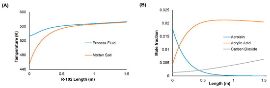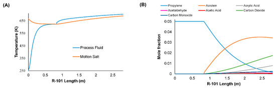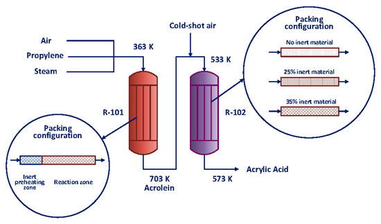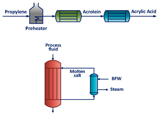 Redlingshofer et al. [6] presented reaction kinetics that were valid in the temperature range from 633–703 K for the partial oxidation of propylene. Typically, a preheater would be used to ensure that the reactor feed temperature is within the required range for the reaction kinetics. The duty of heat exchange equipment required to increase the R-101 feed from a mixture temperature of 363 K to 633 K was calculated on Aspen Plus® (AspenTech, Bedford, MA, USA) as 6.19 MW. In typical Lurgi GmbH and Nippon Kayaku processes of acrylic acid, recovered heat from the exothermic reactions is used to generate steam. Instead of generating steam, in this work, an inert preheating zone was used in R-101, as illustrated by Figure 3, to use the heat absorbed by the molten salt circulating in R-101. This concept was derived from the production of phthalic anhydride.