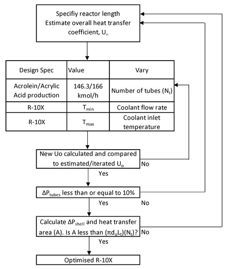 The optimization procedure, illustrated by Figure 2, entailed iteratively adjusting the tube length to determine the most efficient length for the reactor. The reactor tube length affects the tube and shell side pressure drops since pressure drop correlations are directly proportional to tube length. In addition, the tube length determines the overall dimensions of the reactor since the tube length is inversely proportional to the number of tubes. The tube length was therefore iteratively varied whilst Aspen Plus® (AspenTech, Bedford, MA, USA) models were used to determine the minimum number of tubes required for the respective tube length, the thermal fluid inlet temperature and thermal fluid flow rate required. The minimum number of tubes was governed by the propylene and acrolein conversions specified, which was ultimately dependent on the reaction kinetics and heat transfer within the reactor. Both the reaction kinetics and heat transfer were constrained by the allowable temperature ranges per reactor. The allowable temperature ranges per reactor were controlled by varying the thermal fluid inlet temperature and flow rate. Preliminary base case reactor optimizations illustrated large tube side pressure drops that were not conforming to the allowable 10% design constraint for economical and practical industrial reactors. Hollow cylinder catalyst particles were selected for the simulation to improve the tube side pressure drop to within the design constraint. Following the optimization of the tube side pressure drop, preliminary analysis was conducted on the shell-side pressure drop. The shell-side pressure drop was increased to promote more efficient heat transfer on the shell side. The same methodology was applied to reactor R-102.