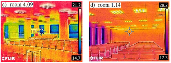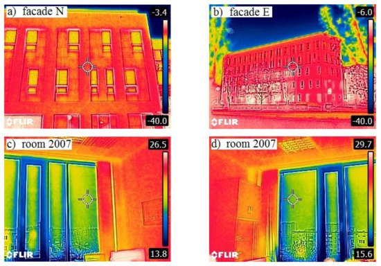 The buildings have been properly insulated to ensure low heat losses to the environment, which is particularly important in Poland, where winters can be severe with outside air temperatures falling to ca. −25 °C. The thermographic analysis conduced in both buildings revealed no major problems or defects. Figure 3 and Figure 4 present the investigation results of thermal fields observed from the outside and in selected rooms.