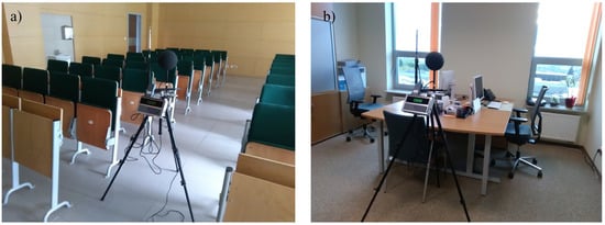 The measuring device was located on the tripod in the central part of the analysed rooms. Figure 5a and b present the experimental set-up in a lecture room in the Energis building and in an office in the courthouse, respectively.