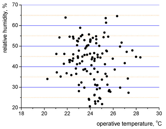 For some rooms the test results indicate that the indoor microclimate can be considered unsatisfactory. Operative temperature exceeds the maximal value of 26 °C as given in the standard [8] for eleven measurement sets (ca. 9% of cases). Although, it needs to be noted that this might have happened due to the preference of the room occupants, who might have liked such warm environments and were unwilling to switch on air cooling. In terms of relative humidity, its optimal value depends on a number of parameters, however some data points in Figure 6 fall below the 25% level (almost 7% of cases). Consequently, a sensation of discomfort might be generated, if solid particles or other air contaminants are present in the air.