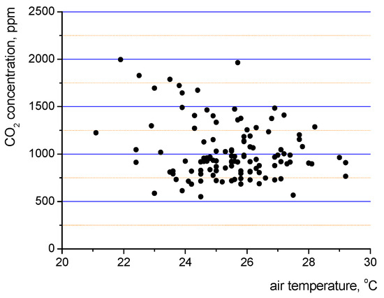 During the surveys carbon dioxide concentration was also determined. Its required value, like in the case of operative temperature, depends on the building category. For the buildings within category II (to which both analysed buildings belong) the upper limit is 800 ppm plus the outside air CO2 level [8]. Figure 7 presents the data of indoor air temperature and carbon dioxide concentration from 118 measurement sets. The analysis of the figure indicate that some measurements are characterised by elevated levels of carbon dioxide concentration.