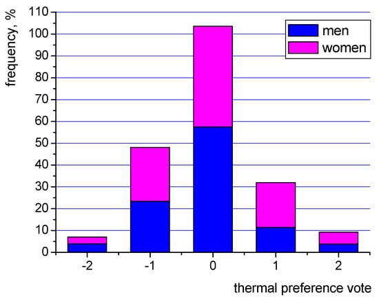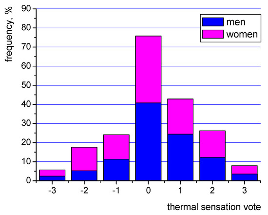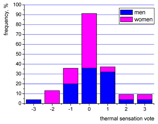 As can be seen the largest number of women (ca. 55%) and men (36%) rated the indoor conditions as very good (a neutral “0”). Generally, almost 85% of occupants expressed positive opinions (from “−1” do “+1”) about their thermal sensations, which almost meets the requirements of the standards [6,8] of 90%.