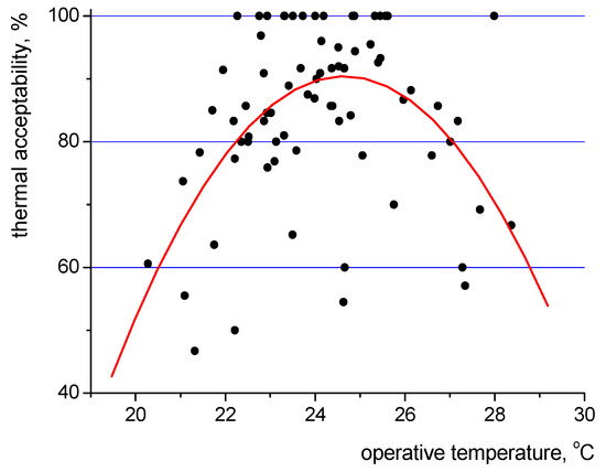 The analysis of the acceptability of indoor conditions reveals that occupants voted overwhelmingly in favour of the thermal environment (over 80% of cases) when the operative temperature was in the range of 22–26.5 °C. The 90% level of acceptability was generally achieved for 22.5–25.5 °C (Figure 12), albeit with some exceptions.