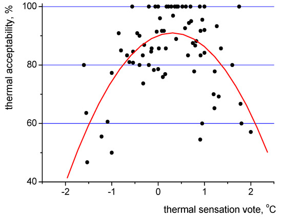 A study on human thermal perceptions reveal other interesting facts. A relationship between thermal acceptability and thermal sensation votes has been presented in Figure 14. A strong correlation between these two parameters exists.