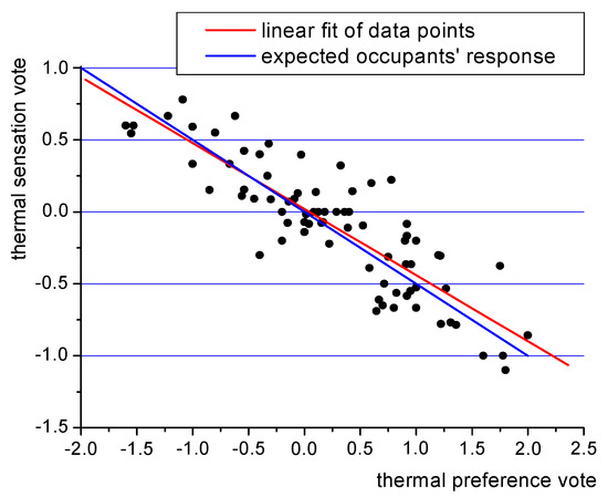 It is also worth noting that people’s preference vote—namely, the will to increase, decrease or maintain the temperature in the room—should be absolutely correlated with their thermal sensation vote. If the occupants consider the indoor environment to be “too hot” (+3) then their thermal preference should be: “much cooler” (−2). Similarly, if they rate the environment to be “too warm” (+2), their preference response should be: “cooler” (−1). If their thermal sensation is fine, they would require “no change” (0). The same situation would occur in the “cold” range of thermal sensation votes. Such a theoretical correlation has been presented in Figure 15 as the blue line. The figure also contains experimental data obtained during the study and their linear fit.