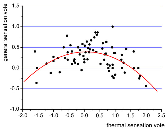General sensation vote above 0 indicates the positive assessment of the environmental conditions. It occurs mostly in the range of thermal sensation votes from −0.75 to +1.25. It further proves the idea already mentioned in Section 3.2. that people tend to like warmer environments. At the same time, the respondents tend to assess the environment as negative (general sensation vote below 0), if the thermal conditions are perceived to be too hot or too cold, albeit with some exceptions. A deviation from this trend might be attributed to the influence of other factors, such as air humidity, carbon dioxide concentration as well as other individual factors such as BMI.