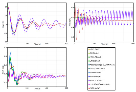 A better match of the yaw inertia value could have been achieved by segmentation of the cylindrical structural elements of the spar-buoy. However, with unknown number of segments and length distributions, a full match of all inertia values at the same time is questionable to be obtained. Thus, as the focus in this paper is the verification of the modeling approach and implemented theories and coupled dynamics, a compromise is needed between available data and perfect match of resulting system properties. As mentioned above, the main focus is on the most important inertia components, namely for roll and pitch, and, hence, the discrepancy in the system yaw inertia is accepted and accounted for when analyzing the results of the code-to-code comparison, as covered in