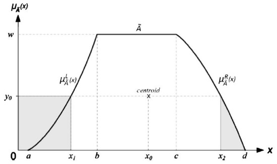 At the defuzzification stage, the vector shown in Equation (13) is generated. is a vector of basic event failure probabilities produced by the decoding membership function using the area defuzzification technique (ADT) [24]. ADT is a technique for defuzzifying fuzzy numbers into single values. Figure 4 explained more about ADT. If à = (a, b, c, d) is a normal trapezoidal fuzzy number, which then becomes a normal triangle fuzzy number because of b = c, then ADT is calculated using Equation (14).