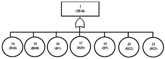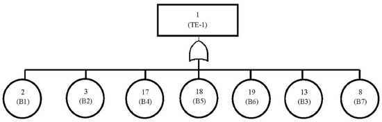 The fault tree of the primary cooler natural circulation (FT-7) is as shown in Figure 8. The top event probability for FT-7 calculated using Equation (17) is equal to 3.265 × 10−5.