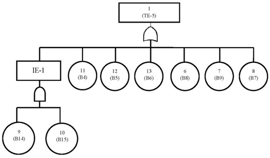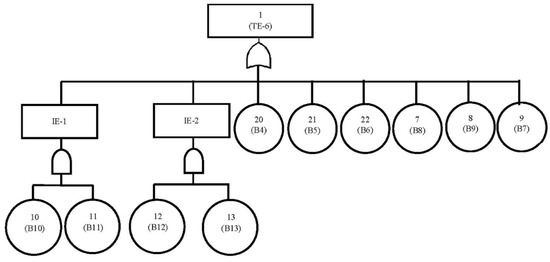 The fault tree of secondary system isolation (FT-6) is simplified and shown in Figure 7 by applying the idempotent law of Boolean algebra. The probability for FT-6 is first calculated by calculating the probability of two intermediate events using Equation (18), and the result is 4.73 × 10−11. Then, the top event probability for FT-6 calculated using Equation (17) is equal to 3.589 × 10−4.