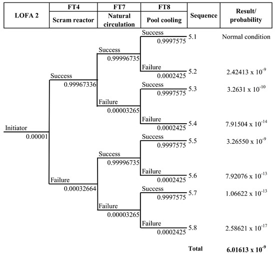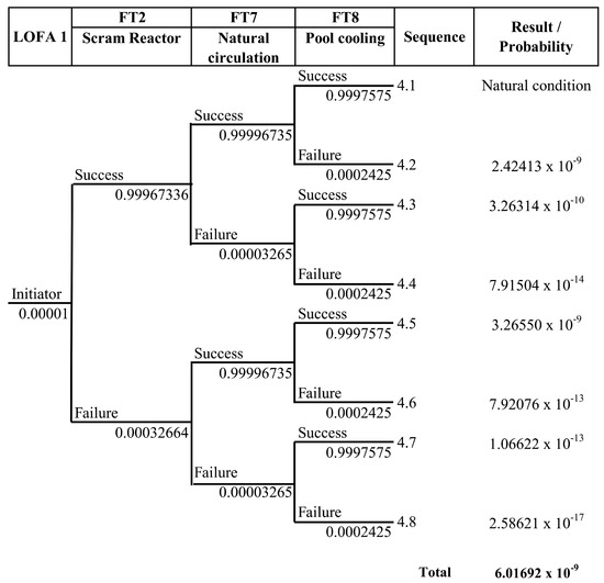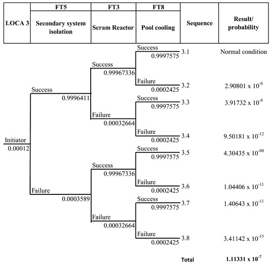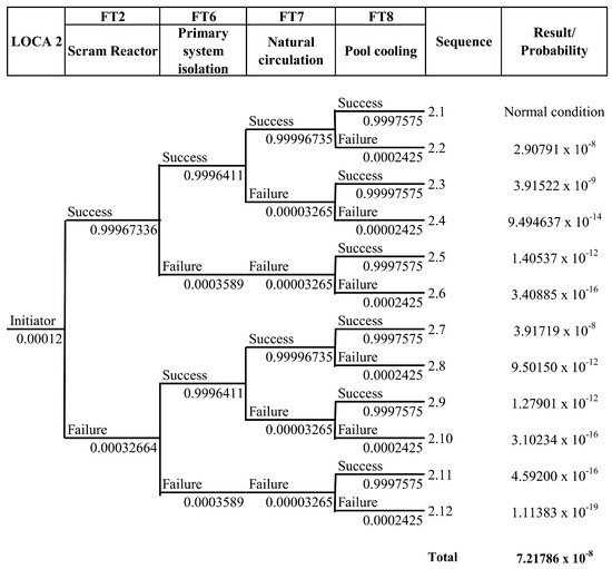 LOCA 1 is a loss of coolant due to leakage of the primary cooling pipe after the isolation valve. If there is a leak in the area after the isolation valve, and the pond water level drops below 12.25 m ± 0.05 m, the reactor protection system will shut down the reactor, the primary isolation valve will shut down automatically, and the pump will be extinguished. The next step is to open the natural isolation valve automatically because of the effect of gravity when the primary system flow rate falls below 15%. Then, the cooling stream through the core reverses its direction (to stream upward), and the discharge of decay heat from the core to the pond water occurs through natural convection. The heat retrieval by the primary system will stop. However, the decay heat of the substance continues. For that, the heat recovery function is transferred to the pool cooling system. The probability of each sequence in the ETA diagram was calculated using Equation (18); for example, the probability of sequence 1.2 is shown as follows, and the calculation results for all sequences can be seen in the LOCA 1 event tree in Figure 10.