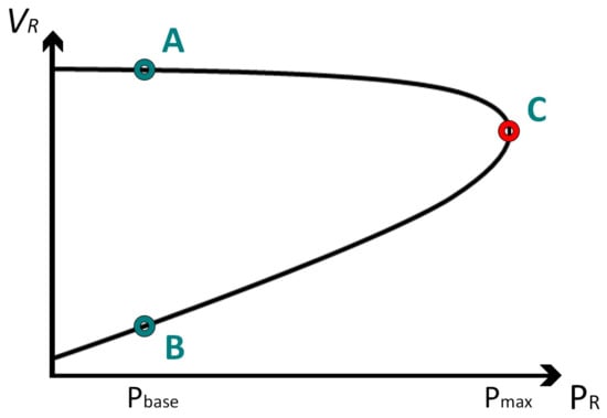 As we have seen, the simplest case of power system can be represented as a constant voltage source that feeds a load through an impedance. In such a situation, there is a maximum value of active power that can be transmitted for a fixed power factor (Figure 2). For any value of active power at the receiving end () such as , we can find two operating points. On the one hand, at the upper point (A), any decrease in results in an increase of . On the other hand, at the lower point (B), any decrease in results in a decrease of . Since voltage controllers are designed to operate in region A, when operating in region B the system becomes unstable. Hence, the conditions in which represent the limit of satisfactory operation. The values of voltage and current corresponding to that point (C) are referred to as critical values [2]. When dealing with complex power systems, the situation in which the voltage in one or more nodes inevitably falls is referred to as voltage collapse.